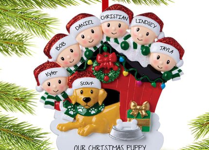 Celebrate your furry friend with this personalized Xmas ornament featuring family of 5 with dog in doghouse ornament.