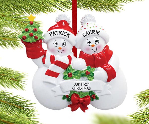 Create lasting memories with this personalized ornament featuring snowmen with banner couple ornament.